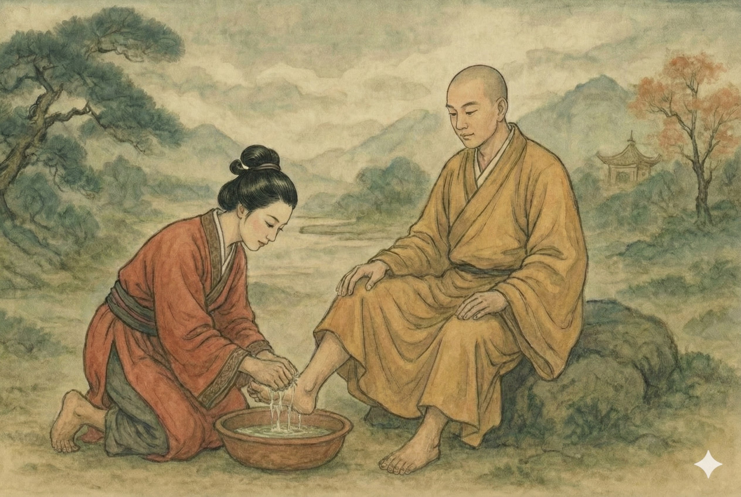 “那好!”和尚笑着说,”你要是真有诚心,就亲手给我洗洗这双脚吧!”说着就当场脱起鞋来。